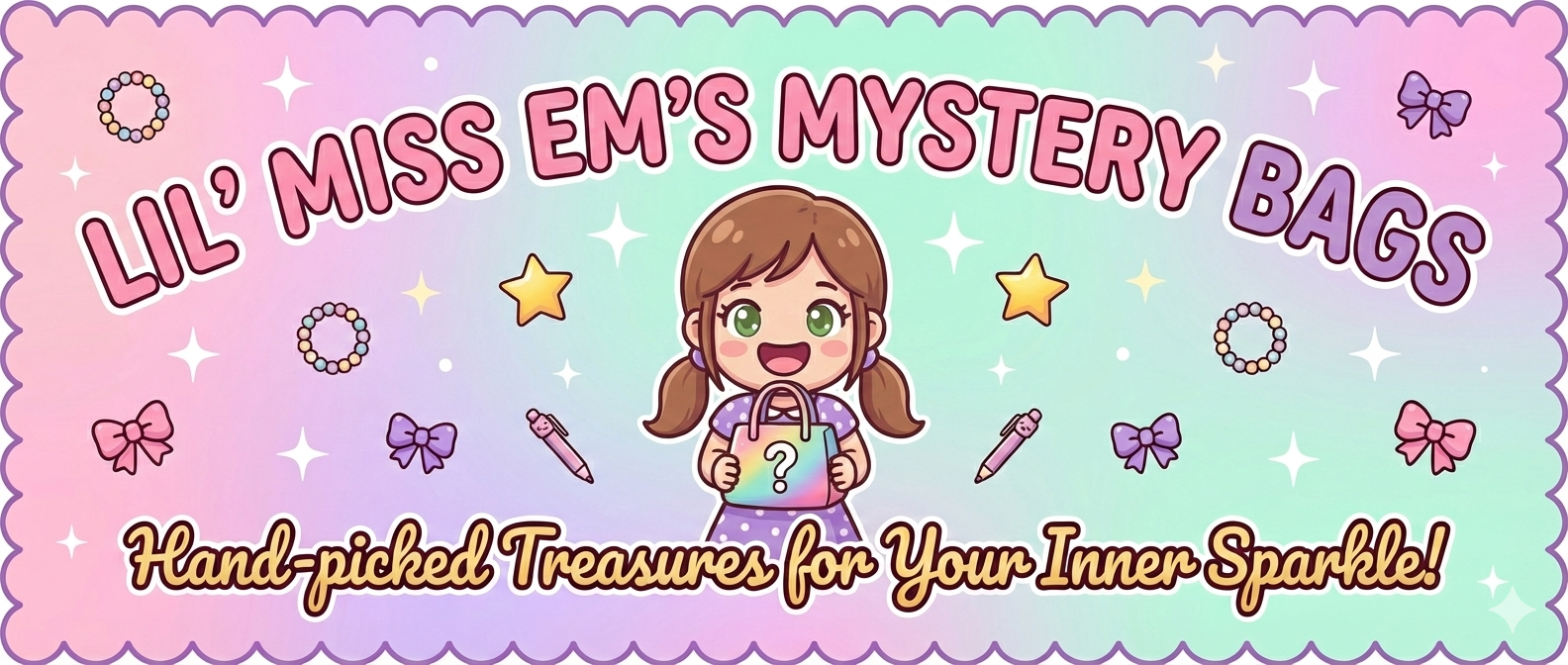 Lil’ Miss Em’s Mystery Bags was founded to bring excitement and delight through themed surprise bags filled with jewelry, pampering items, fun handmade keychains, pens and retractable badge holders along with many more fun surprises . Our mission is to make gifting and community fun more memorable by sparking curiosity and joy with every bag. We believe in fostering creativity, smiles, and a sense of wonder for all ages.